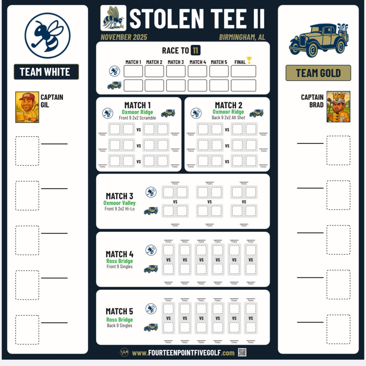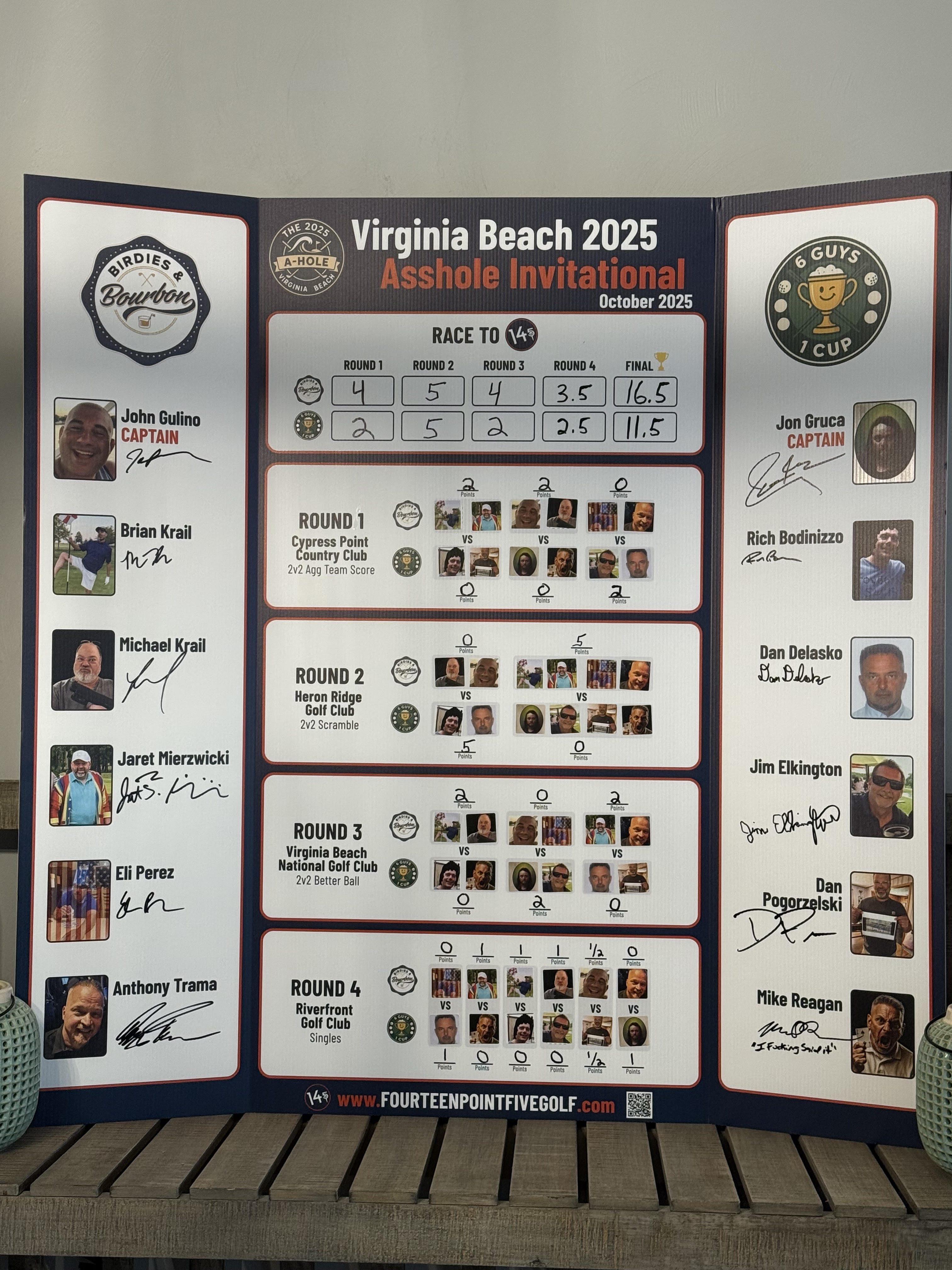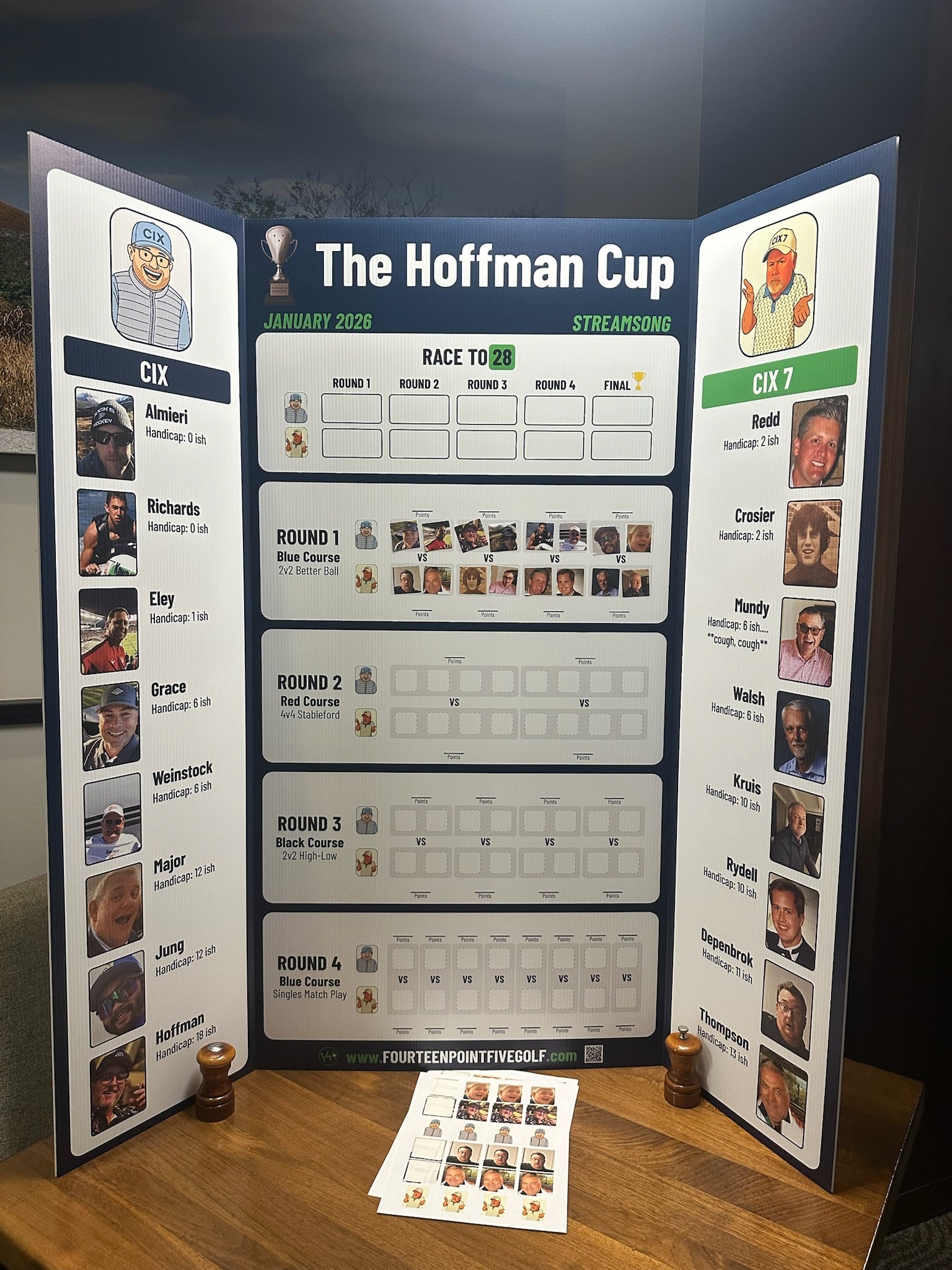 Inspired by the Ryder Cup, FourteenPointFive is the first company to offer custom golf trip Scoreboards to be the centerpiece of your buddies' golf trip - the ultimate way to organize and track your trip and create lasting memories together.