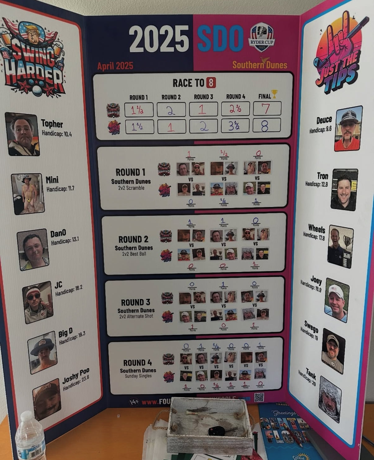 Run your golf competition just like the Ryder Cup using the FourteenPointFive 28 point scoring method OR use your own custom scoring and points system!