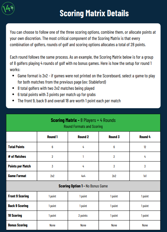 Just like the Ryder Cup, the first team to 14.5 points wins! We've created a scoring guide for groups of 6 to 16 players to help format your competition to total 28 points, all ending in epic singles matches just like the Ryder Cup!